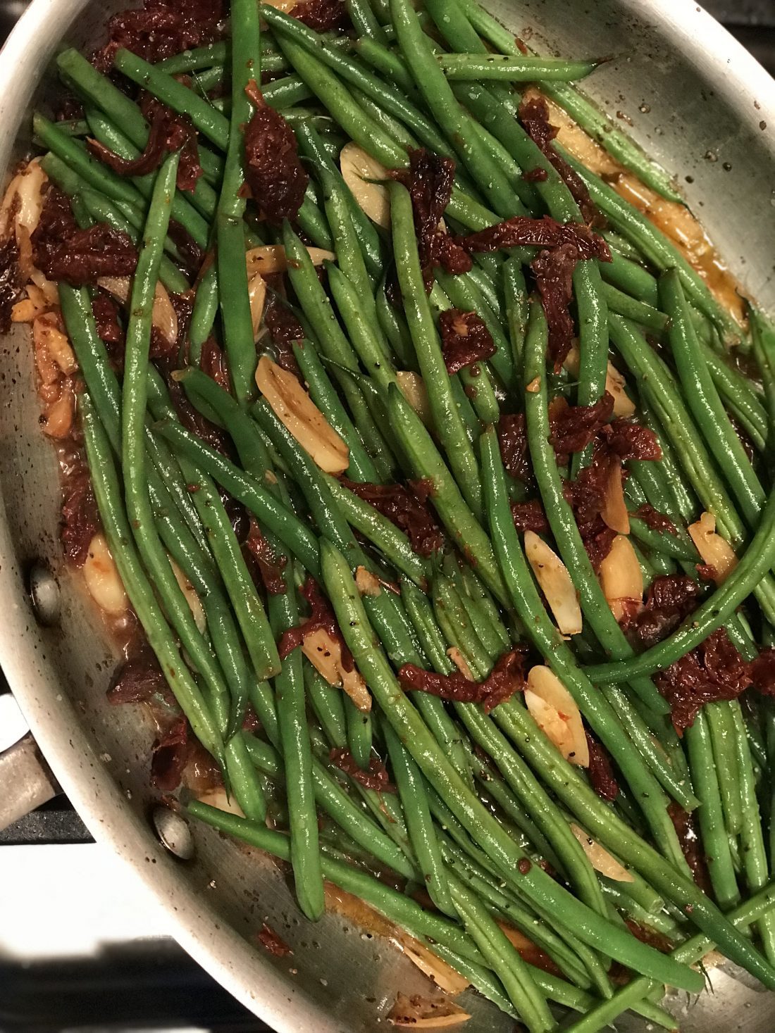 Place the green beans into the skillet and toss with the sun-dried tomatoes and garlic. Taste and season with salt and pepper.