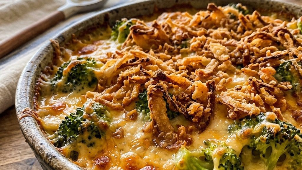 This recipe elevates a beloved old-school comfort side dish through careful timing and layering. By blanching the broccoli to an exact crisp-tender state before folding it gently into a fresh, sharp cheddar béchamel, we keep it vibrant and tender without breaking down. A heavy final layer of crispy fried onions provides a nostalgic, satisfying crunch.