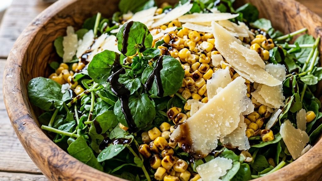 The foundation of this dish requires an unapologetic commitment to crunch. We mix hearty Cos (Romaine) leaves with the often-maligned but texturally superior Iceberg lettuce to ensure the base stands up to a heavy dressing. We layer in ribbons of crisp cucumber, freshly blanched sweet corn kernels, and the sharp bite of watercress.