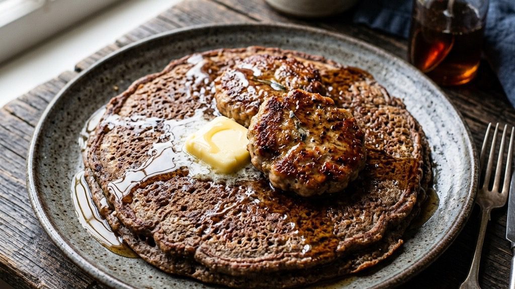 Buckwheat Flapjacks with Sausage and Maple Syrup