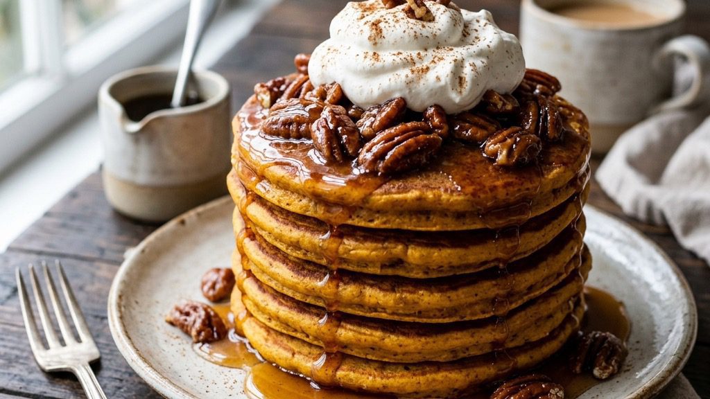Pumpkin Pie Pancakes with Sugared Pecans