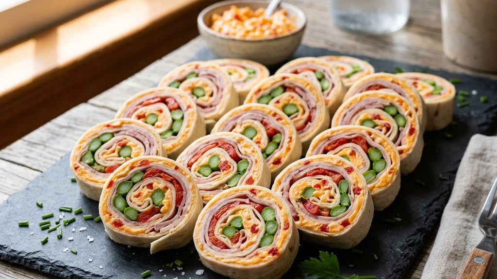 Pimento Cheese Pin Wheels with Turkey, Ham, and Asparagus Spears