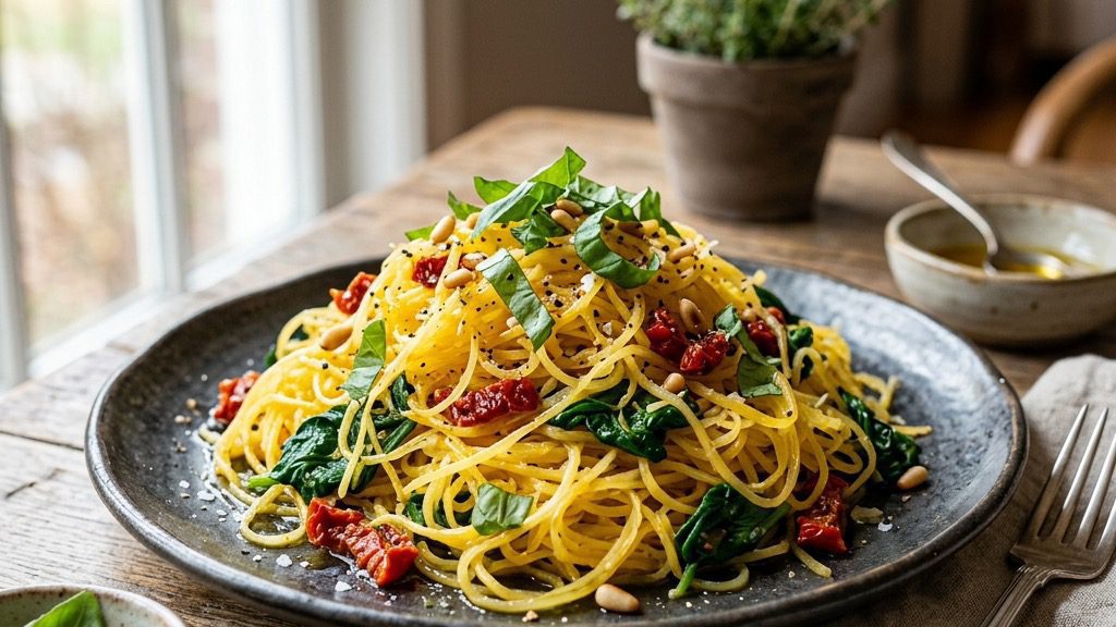 Honey Roasted Spaghetti Squash with Spinach and Sun-dried Tomatoes