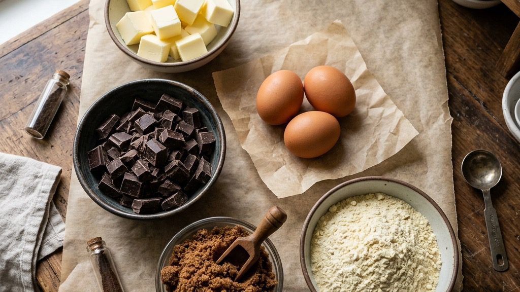 After melting the butter and dark chocolate over a double boiler, you stir in the sugars. Then, the critical step: add the eggs and whisk the batter as aggressively as possible for exactly one full minute. Do not cheat the clock. That intense aeration dissolves the sugar crystals into the egg whites, which eventually rise to the top of the pan during baking to form the legendary crackly crust. Fold in a touch of crema pastry flour at the very end to keep the interior impossibly dense and fudgy.
