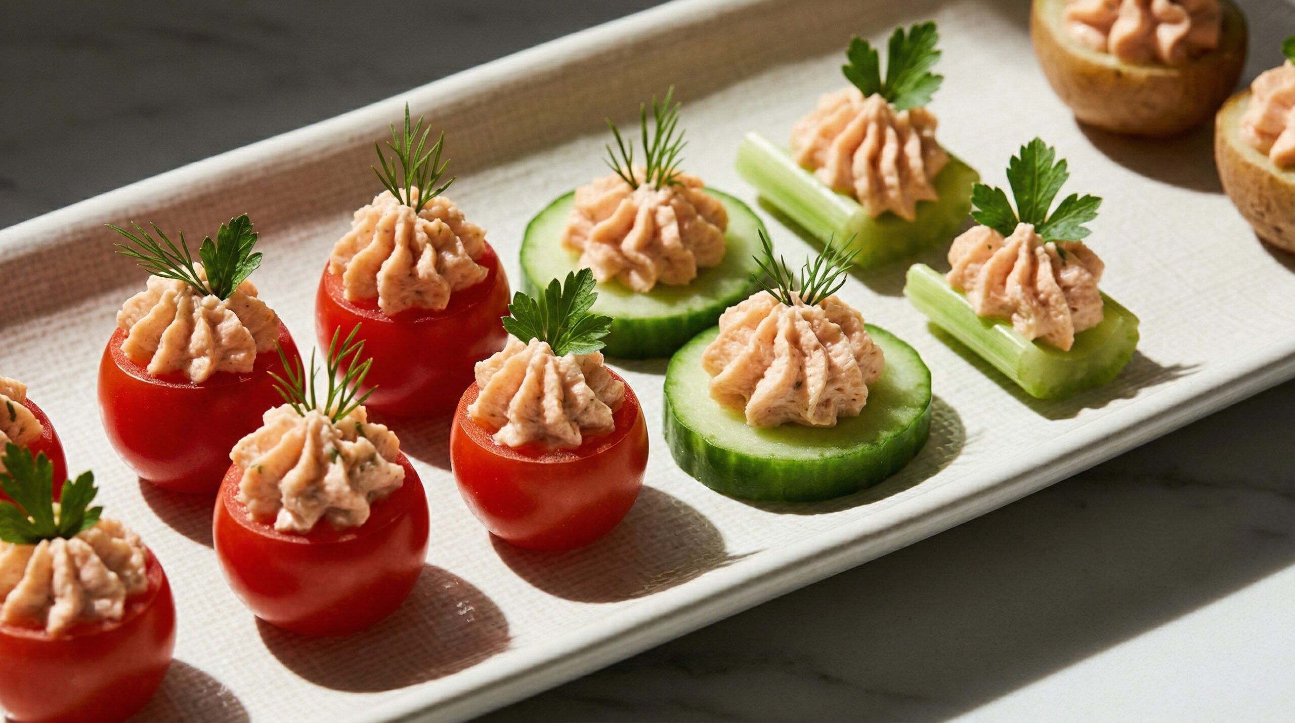- THE PRESENTATION: Do not pipe the mousse while it is warm, or it will weep out of the vegetables. Once properly chilled, pipe towering, ruffled star-shapes into the hollowed cherry tomatoes and celery sticks. Garnish the absolute peak of each bite with a single, tiny sprig of fresh dill to provide a striking visual and aromatic lift.