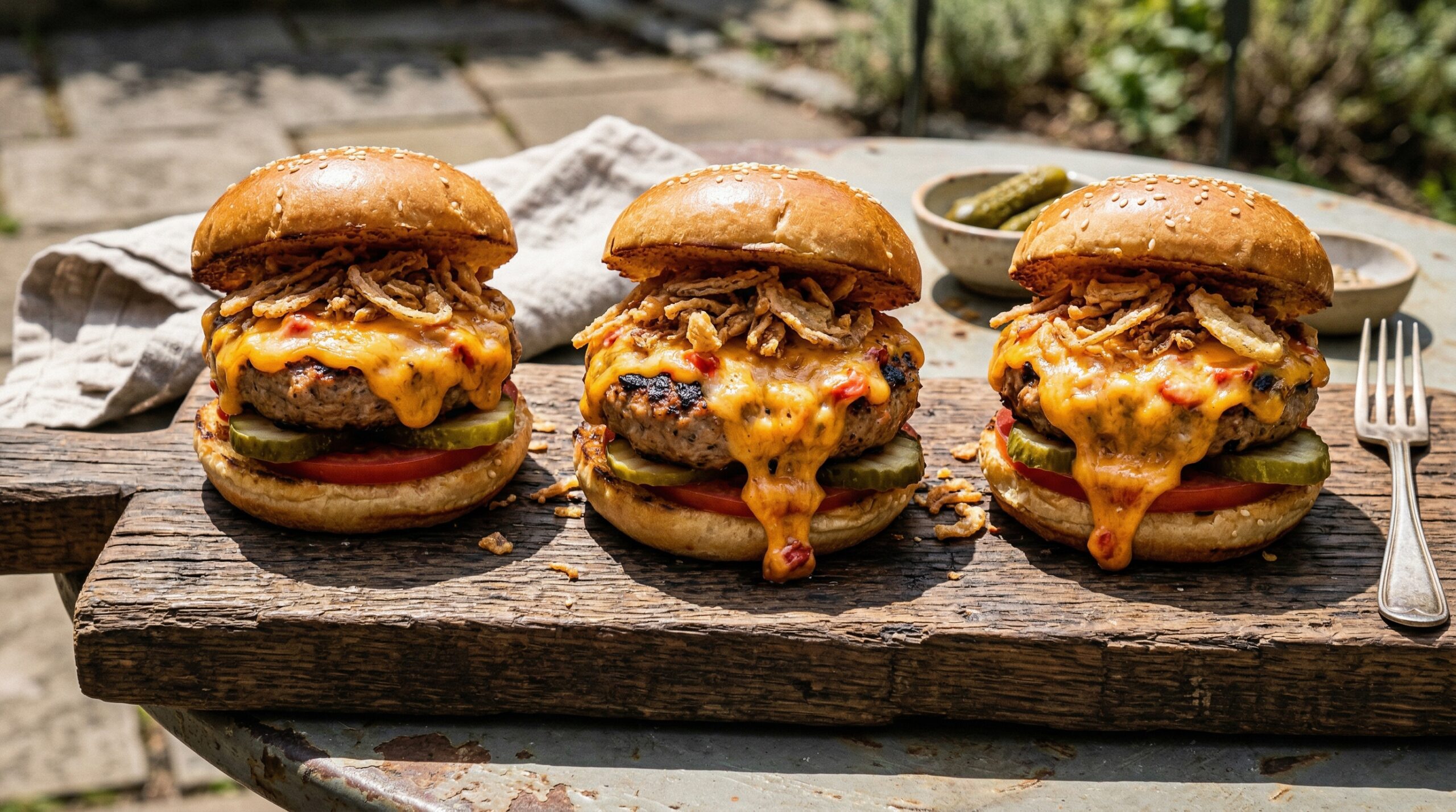 A masterclass in lean protein hydration and mechanical dairy emulsions. By fortifying lean ground turkey with olive oil and Worcestershire, these high-heat sliders remain incredibly juicy. They are crowned with a mechanically whipped pimento cheese and shattered, crispy fried shallots for extraordinary textural contrast.